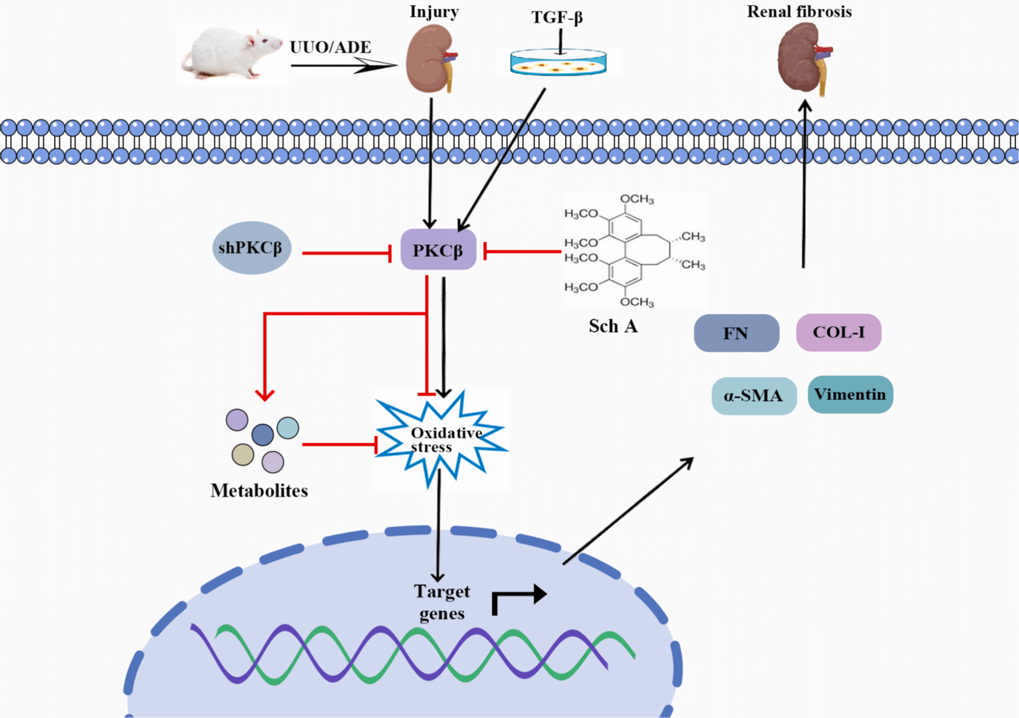 PKCβ是蛋白激酶C家族的一个成员,在癌症、阿尔茨海默病和糖尿病中起着重要调节作用。有研究表明,PKCβ特异性抑制剂可以改善UUO小鼠诱导的肾损伤。我们通过转录组学技术分析发现PKCβ在UUO小鼠肾脏组织显著上调。肾脏特异性敲低PKCβ显著改善了UUO和ADE模型诱导的肾脏纤维化并抑制氧化应激的水平。通过血清代谢组学技术发现敲低PKCβ可以上调潜在抗氧化代谢物1,5-AG、牛磺酸和β-羟基丙酮酸等的水平。我们发现中药五味子中的主要活性成分五味子甲素可以通过抑制PKCβ的表达和抑制氧化应激的水平从而改善UUO诱导的肾脏纤维化。并且,体外过表达PKCβ部分消除了五味子甲素的药理作用,表明PKCβ是五味子甲素抗肾纤维化和抗氧化作用的关键蛋白。该论文努努影视