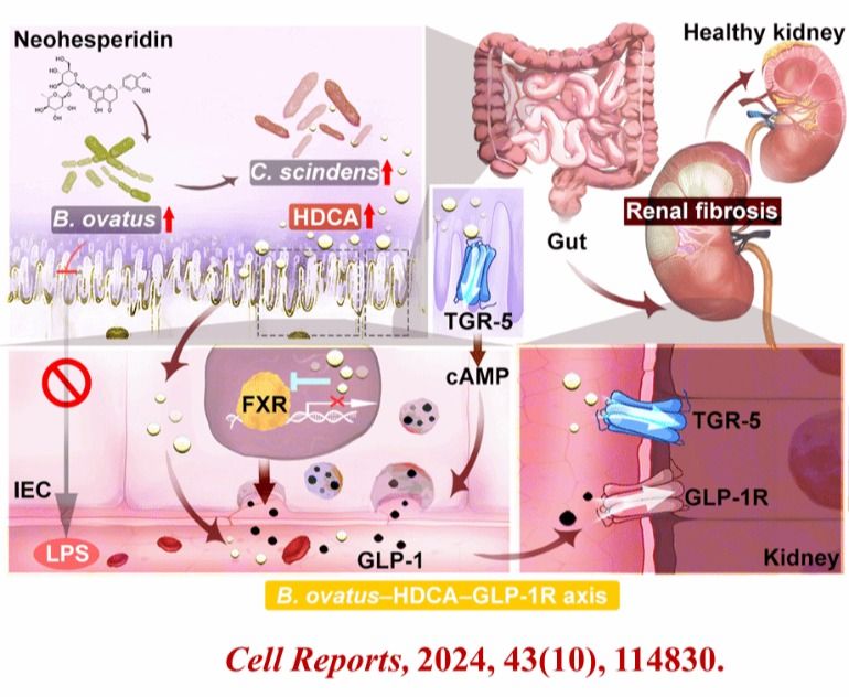 课题组首次发现小鼠定殖卵形拟杆菌(B.ovatus)后具有改善CKD和肾纤维化的作用。机制研究发现,B.ovatus能够促进肠道闪烁梭菌(C. scindens)的生长, 而C. scindens能够直接在肠道中产生活性内源性分子猪去氧胆酸(HDCA)。HDCA能够显著下调肠道FXR,上调肠道TGR5的蛋白表达,进而促进肠道L细胞分泌GLP-1。GLP-1通过血液循环到达肾脏激活GLP-1R发挥肾脏保护作用。此外,我们通过筛选发现天然产物新橙皮苷(NHP)通过促进B.ovatus的生长来发挥其抗肾纤维化作用。该论文努努影视
