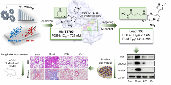 在本研究中,研究团队运用人工智能辅助虚拟筛选平台,整合基于结构的药物设计方法,从先导化合物T3700(IC50 = 725 nM)出发,通过系统的结构优化与构效关系研究,成功设计合成了高活性化合物13c。该化合物对PDE4的抑制活性(IC50 = 2.7 nM)相比先导化合物提升了268倍,展现出纳摩尔级的抑制活性和良好的体内外抗IPF药效。共晶复合物的结构揭示13c对PDE4具有“卤素结合-金属配位”双重协同作用的分子机制,为后续PDE4抑制剂的合理设计提供了结构生物学依据。