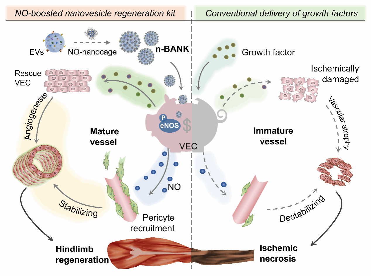 重症肢体缺血是外周动脉疾病的最晚期形式,该类患者在6个月内截肢风险为25~40%,年死亡率高达20%。目前,血运重建手术是临床主要治疗方案。但由于自体静脉移植物缺乏、胫动脉和腓动脉广泛病变或并发症发病率高,25~50%的重症肢体缺血患者无法进行手术治疗。临床上尚缺乏治愈重症肢体缺血、提高保肢率的药物。因此,寻求促进血管新生、治疗重症肢体缺血的药物治疗手段具有重要意义。基于此,该研究团队在“Enhanced pericyte-endothelial interactions through NO-boosted extracellular vesicles drive revascularization in a mouse model of ischemic injury”研究中设计了一款具有NO存储功能的干细胞纳米囊泡n-BANK,利用白蛋白与磷脂酰丝氨酸的亲和力将NO-白蛋白纳米笼嵌合至干细胞囊泡表面,发挥调节血管内皮细胞功能、重塑下肢血运的功能。在此项研究中,n-BANK通过递送干细胞活性生长因子,修复受损血管内皮细胞活力,促进血管样结构形成;同时激活血管内皮细胞中eNOS蛋白的表达,促使内源性NO产生,进而招募周细胞与之协同搭建功能性血管组织。此药物设计有效克服了单独生长因子难以招募周细胞、促进功能性血管再生的缺陷,并利用NO纳米笼激活内源性NO产生、诱使NO长效释放,在小鼠模型上实现单次给药即达到100%保肢率的优越治疗效果,为再生药物设计提供一种新的治疗方案。
