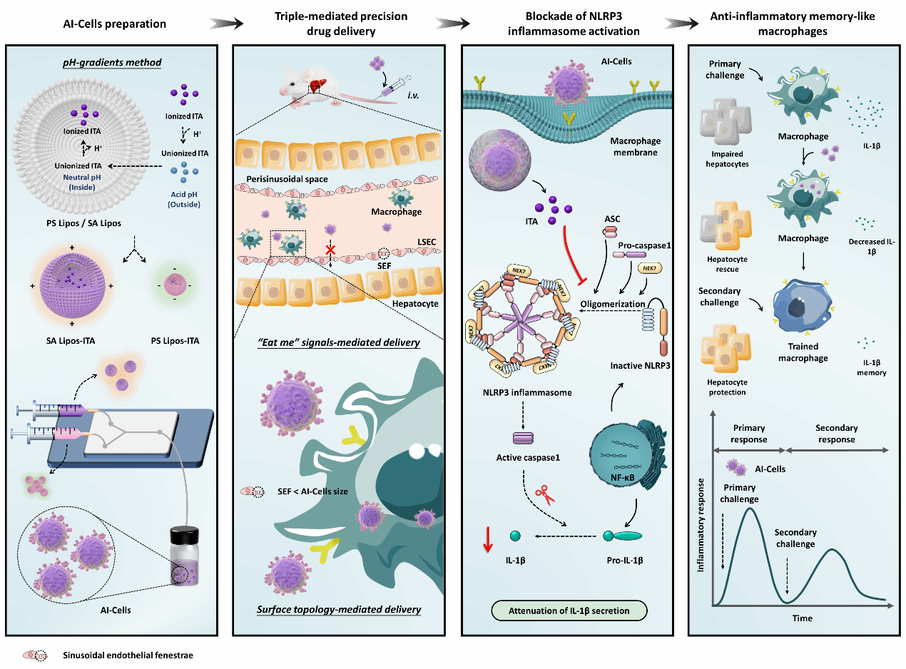 病毒感染或药源性副作用是引发致命性肝衰竭的主要原因。目前肝移植是治疗非逆转性肝衰竭的有效方法,但供体肝脏短缺、错过移植最佳时期以及长期免疫抑制等不良反应极大地限制了肝移植的适用性。因此,寻求拯救肝衰竭、并长效保护肝功能的治疗方案具有重要意义。基于此,该研究团队在“Artificial cells delivering itaconic acid induce anti-inflammatory memory-like macrophages to reverse acute liver failure and prevent reinjury”研究中设计了一款负载衣康酸的人工治疗细胞AI-Cells,用以模拟凋亡细胞拓扑结构和细胞膜组成,并成功实现了对肝巨噬细胞的精准捕获。在此项研究中,AI-Cells通过干扰NLRP3炎症小体的自组装调控肝巨噬细胞使其恢复稳态;同时诱导抗炎记忆样巨噬细胞产生,进而对急性肝衰竭和肝再损伤产生了良好的治疗作用。此药物治疗方法可高效逆转肝衰竭,并长效保护其免受再次损伤。此设计具备临床转化潜力,未来或可成为肝移植的替代方案。