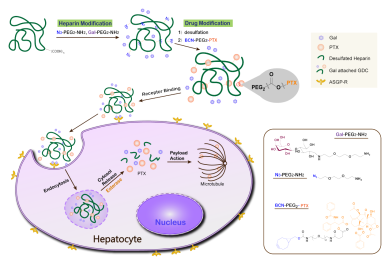 肝素作为抗凝血药的应用已有百年历史,由于其与多种蛋白的结合能力及良好的生物相容性,是近期药物递送载体的研究热点。但其本身抗凝血能力会造成病人的出血风险。此论文提出了一种以脱硫酸肝素为载体,半乳糖作为靶向小分子,毒性小分子紫杉醇作为治疗药物的三组分药物递送系统。