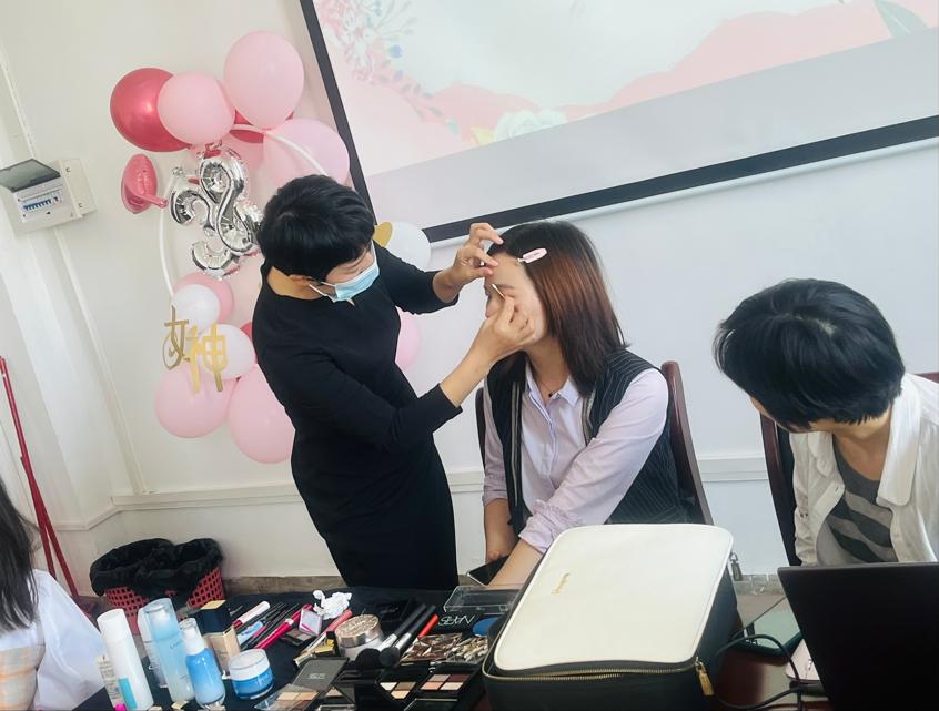 赵老师从美学妆容视角切入,剖析了如何正确选择化妆品、如何完美使用化妆品及化妆品日常使用顺序、方法和选购等。随后,现场向大家展示了化妆技巧,手把手教大家变美丽,并为参加活动的女教职员工打造了美丽妆容。女教师们带着浓厚的兴趣,认真听美妆老师的讲解,把自己的疑惑及时与老师提出,大家积极参与其中热烈互动,现场气氛轻松有趣。