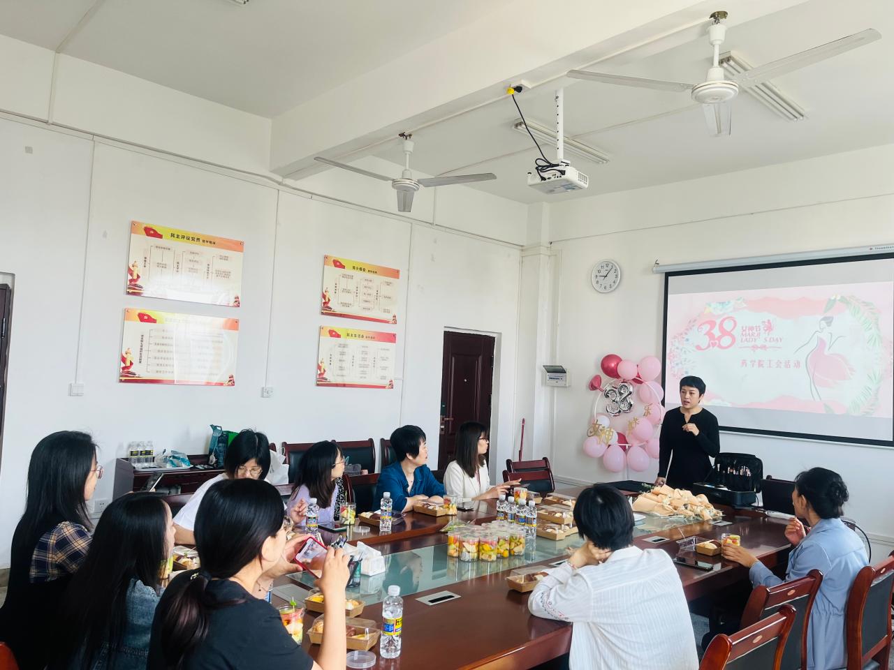 活动最后,学院党总支书记、工会主席胡静为辛勤工作在工作岗位上的女教职工准备了精心制作的蛋糕面包、水果和鲜花,送上最甜蜜的节日礼物和美好祝福,让女教职工们感受到了浓浓的节日氛围。