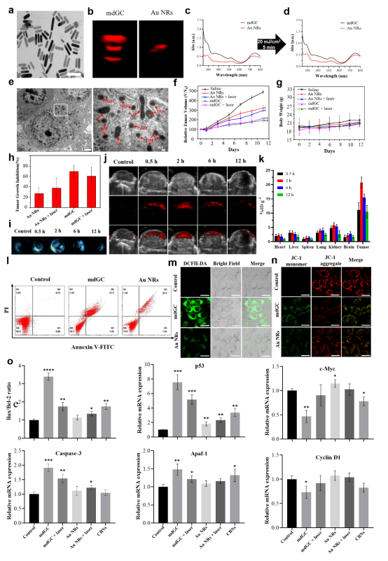 图2. a) mdGC的TEM图像,比例尺,50 nm。b) 720 nm激发波长下获得的Au NRs和mdGC代表性PA图像。Au NRs和mdGC在激光照射5 min(20 mJ cm-2, 40 Hz)前(c)和后(d)的紫外可见光谱。e) mdGC处理4T1细胞的Bio-TEM图像。f) 不同治疗组的小鼠相对肿瘤体积(n=5)。g) 不同治疗组小鼠的体重变化。h) 不同治疗组小鼠的肿瘤抑制率。i) 不同时间点(0.5、2、6、12 h)肿瘤组织荧光成像;激发波长为405 nm。j) 不同时间点(0.5、2、6、12 h)肿瘤组织光声成像;激发波长为720 nm。k) 0.5、2、6和12 h, mdGC在不同器官中的生物分布。l) 不同处理后4T1细胞的凋亡情况。m) 不同处理4T1细胞后产生ROS的荧光图像,比例尺: 20 µm。n) 通过CLSM观察细胞线粒体膜电位的变化。o) 实时PCR定量分析肿瘤组织中Caspase-3、p53、Apaf-1、Bcl-2、Bax、c-Myc和Cyclin D1基因的表达水平。
