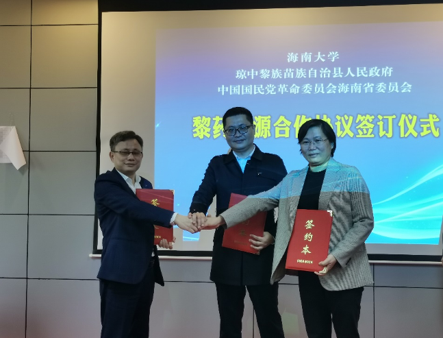最后,罗海彬院长、琼中县人民政府李钊副县长和­民革海南省委会张颖秘书长共同签订《黎药资源合作协议》。民革省委专职副主委陈海平、努努影视