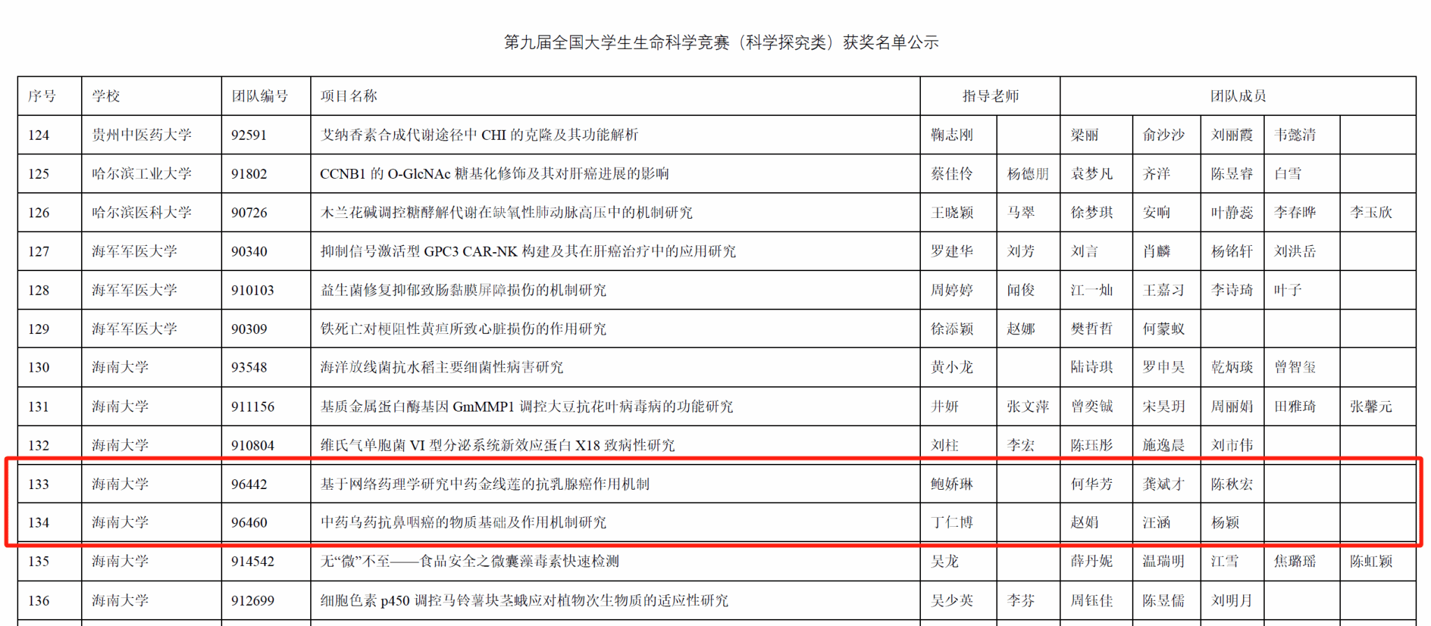 本次获奖的项目分别是由丁仁博老师指导,药学专业本科生赵娟、汪涵和杨颖的项目《中药乌药抗鼻咽癌的物质基础及作用机制研究》,和由鲍娇琳老师指导,药学专业本科生何华芳、龚斌才和陈秋宏的项目《基于网络药理学研究中药金线莲的抗乳腺癌作用机制》。整个赛程长达12个月,同学们经历了讨论选题、查阅文献、设计实验、实践探究、撰写实验记录、形成实验论文和心得、现场答辩等多个环节。在这个过程中,参赛学生的团队协作能力、发现和解决问题的能力、持之以恒的意志品质以及表达与沟通能力都得到了有效的训练。同时,他们也提升了对专业学习的认识,进一步促进了对专业学习的兴趣。