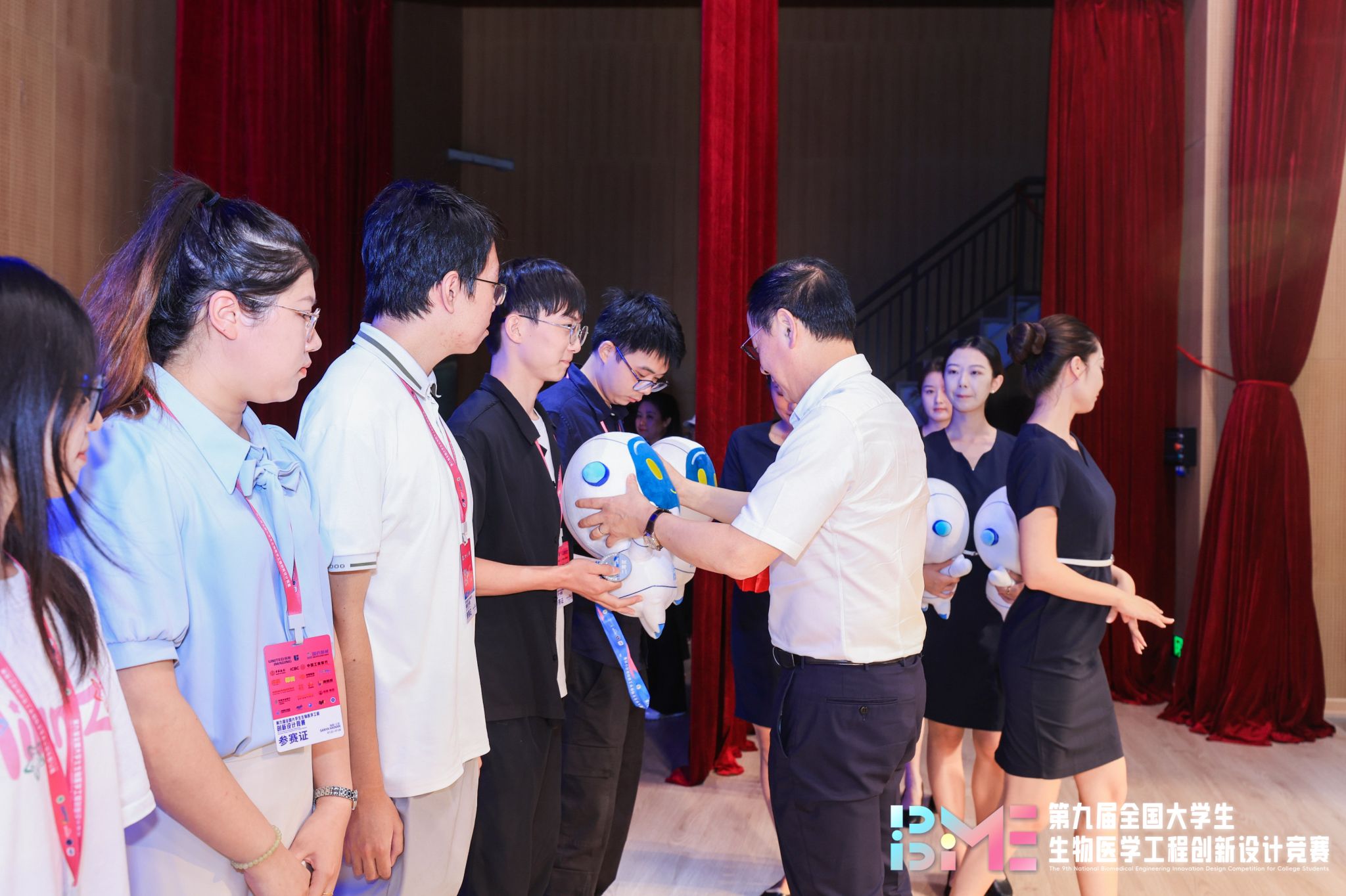“第九届全国大学生生物医学工程创新设计竞赛”颁奖现场(左十一为张榕芮、右三为吕尚优)