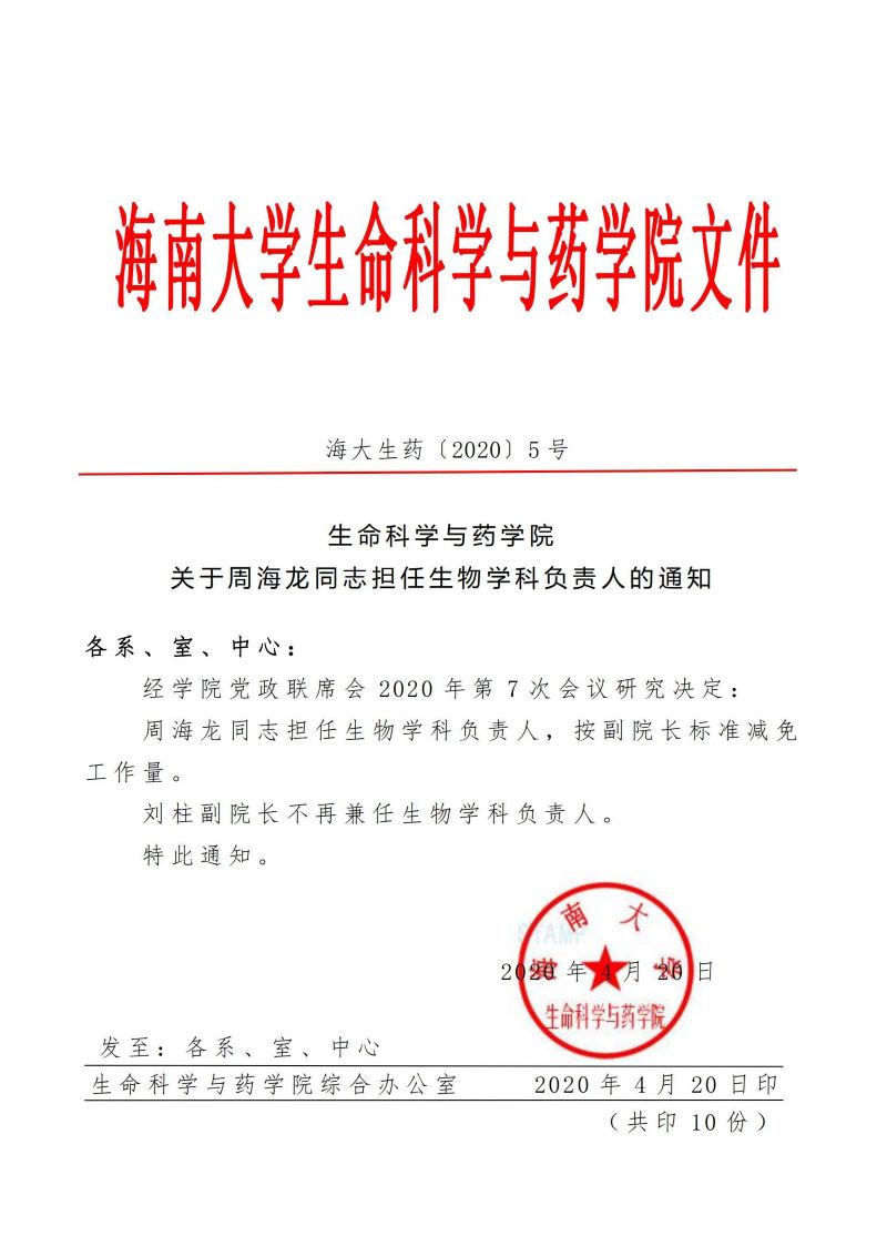 《生命科学与努努影视 关于周海龙同志担任生物学科负责人的通知》(海大生药[2020]5号))