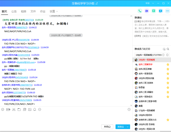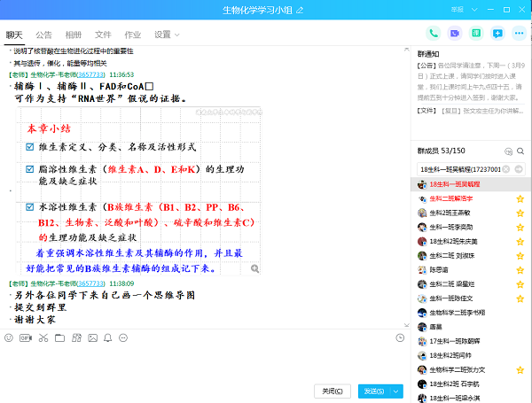 每看完一个小视频,老师及时在QQ群里提出提前准备好的几个小问题,同学们积极回答问题,每个问题都有十几二十个同学积极回答,且回答的正确率非常高,说明同学有认真提前预习及观看视频。还有几个同学私下向老师提出更深层次的问题,如“脂溶性维生素在体内是如何吸收的”,“为什么在水溶性维生素中 要特别提一下 Vpp和Vc过量的症状呢”等。老师及时给予引导回复。