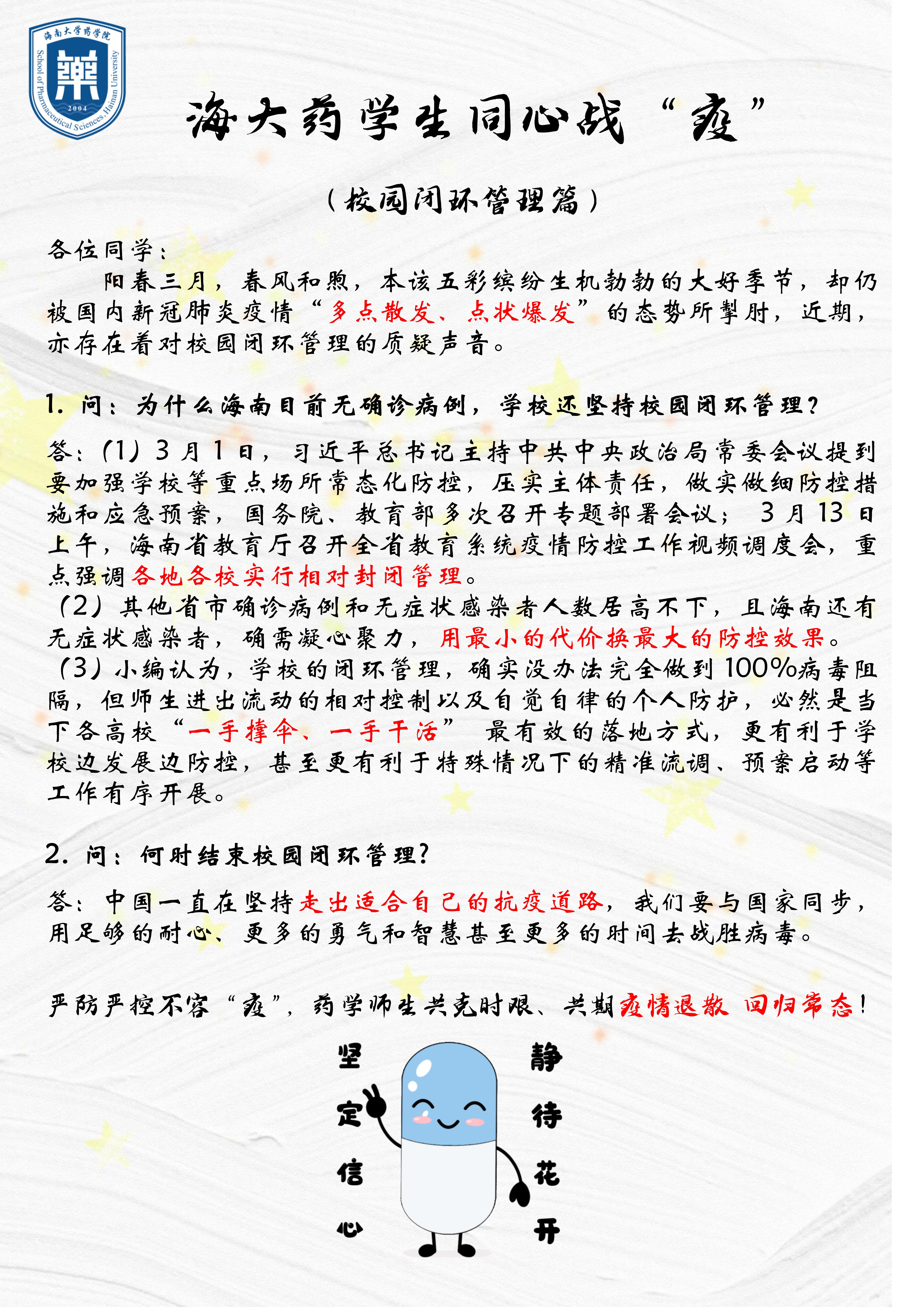 近期,校园闭环管理和严格管控的情况下,随之带来同学们些许不理解的声音,为了给全体同学及时答疑解惑,党支部牵头制作海大药学生同心战“疫”宣传海报,31名党员配合学院领导、班主任和辅导员,通过走课堂、下宿舍的方式进行全覆盖宣传,积极成为学院与学生们之间的沟通桥梁,落实“三讲清”,即讲清学校相对闭环管理的必要性、讲清学校边发展边防控的不懈努力、讲清防疫个体的责任与义务,引导同学们全力配合和支持学校相关防疫措施。