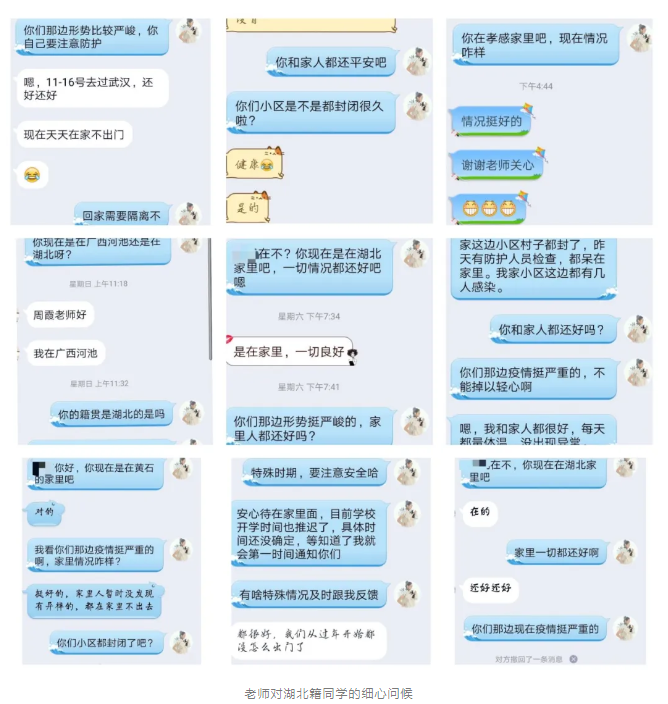 全体领导及老师坚守初心使命,践行岗位职责,他们的一通通电话、一声声问候、一篇篇网文、一个个线上活动,无不体现着对身在各地的学生的关心,他们以思想教育筑起疫情防控阻击战的青春长城。