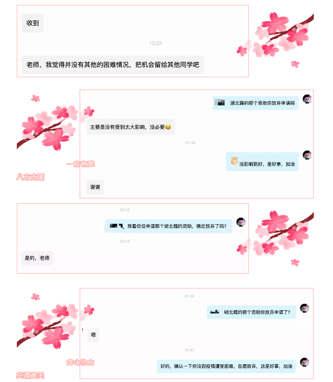 值得关注的是,在资助申请和评选过程中,由于学校资助名额有限,很多同学选择了放弃申请,当老师询问原因的时候,很多同学表示名额有限,虽然自己也比较困难,但肯定有更困难的同学更需要资助,所以放弃申请。