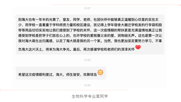 与此同时,这份爱是双向的,隔离病毒但不隔离爱,爱是最好的桥梁,它照亮且温暖了每个人的心,更传达了互相的祝福与心意。同学们感恩学校的热切关怀,向老师们表达自己的感谢,一句句暖心的话,虽远隔万里却让人感觉到心的距离在靠近。