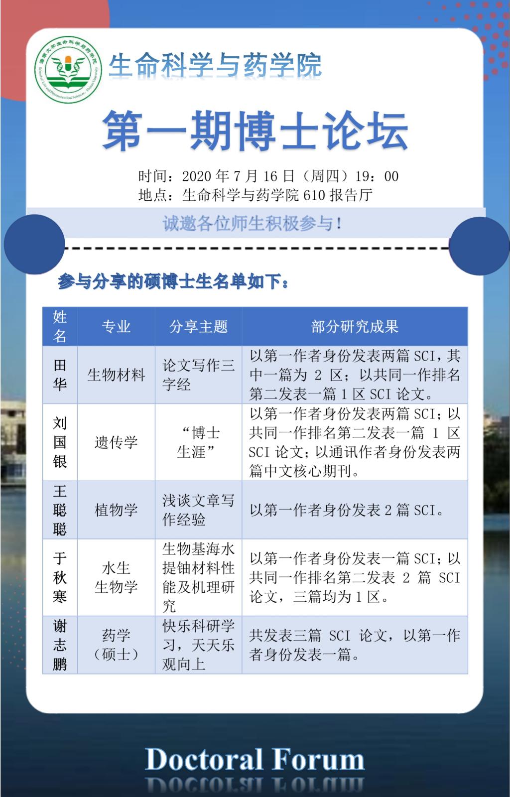 此次论坛参与分享的博士研究生为田华(生物材料专业),刘国银(遗传学专业),王聪聪(植物学专业),于秋寒(水生生物学专业),谢志鹏(药学专业硕士)。届时将分享科研经验、在研方向前沿、论文写作等干货内容。