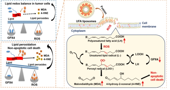 不同于急性肝衰竭,如何增强免疫反应、诱导细胞死亡是抗肿瘤药物的思考方向。为提高抗肿瘤药物的治疗效率,该研究团队在“Unsaturated fatty acid liposomes selectively regulate glutathione peroxidase 4 to exacerbate lipid peroxidation as an adaptable liposome platform for anti-tumor therapy”研究中探讨了脂质体制剂中脂肪酸成分对肿瘤治疗的影响,阐明不饱和酸脂肪酸脂质体可通过增加肿瘤细胞胞内ROS含量,同时下调谷胱甘肽过氧化物酶4(GPX4)的表达,以增加脂质过氧化,诱导肿瘤细胞非凋亡性死亡。此外,不饱和酸脂肪酸脂质体亦可通过ROS途径调节巨噬细胞极化过程,促进抗肿瘤免疫反应。此项研究提示不饱和脂肪酸脂质体具有协同增效化疗药物的作用,为抗肿瘤药物提供了新的制剂应用平台。