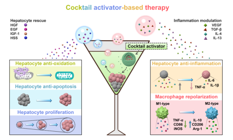 急性肝衰竭发病急、致死率高,寻找有效的药物治疗方法对控制病情发展,为肝移植手术争取宝贵时间具有重要意义。炎症因子风暴和氧化应激损伤是急性肝衰竭重症难治的主要因素。基于此,该研究团队在“Liposome cocktail activator modulates hepatocytes and remodels the microenvironment to mitigate acute liver failure”研究中制备了负载衣康酸的没食子酸脂质体,提出拯救受损肝细胞、调节炎症环境的“鸡尾酒疗法”。在此项研究中,没食子酸脂质体有效将药物衣康酸递送至肝损伤部位,同时激活肝细胞分泌生长因子和修复因子,大幅提高抗炎药物衣康酸的治疗效率,将急性肝衰竭模型小鼠的24小时生存率由50%提高至100%。此药物治疗方法为肝损伤疾病提供一种有效的治疗手段,有望改善急性肝损伤患者的生存质量。