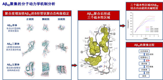 王大勇教授负责的生物技术制药与分子药理学团队,采用分子动力学研究方法,发现Aβ42单体是由β片层构成的球状蛋白,随着聚合度增加,在水溶液中形成最低自由能状态的S型管状结构,并产生三个疏水区;这三个疏水区在不同程度上影响聚合态Aβ42多肽链之间的结合自由能。针对以上三个疏水区,利用自主构建的包含300多万个二至五肽化合物结构的数据库,采用“分子对接-分子动力学-分子药理学”研究方法,筛选出可以抑制Aβ42聚集,降低Aβ42细胞毒性的多种短肽类化合物,并深入分析了精氨酸二肽、以及若干三肽和五肽的药理作用,为研发防治阿尔茨海默病的新药和保健食品提供理论基础和实验依据。部分研究内容近期发表在生物学Top期刊——International Journal of Molecular Sciences. 2023, 24(8):7673。